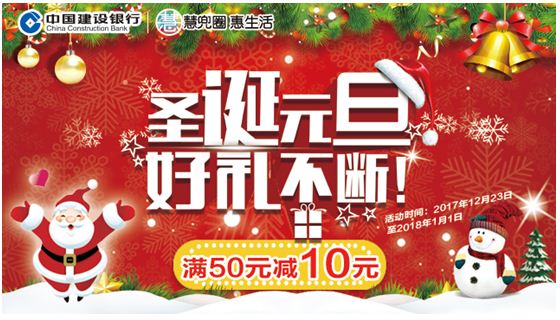 “圣诞元旦、好礼不断”在建行慧兜圈特惠商户消费满50元减10元