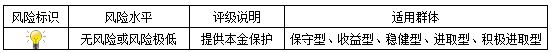 本期产品为保本浮动收益型理财产品,本理财产品有投资风险,只保障理财资金本金,不保证理财收益,您应当充分认识投资风险,谨慎投资。本期产品期限为62天(中国建设银行有权对产品进行展期或提前终止)。本期产品内部风险评级级别为一盏警示灯,风险程度属于无风险或风险极低,适用于保守型、收益型、稳健型、进取型及积极进取型投资者。最不利情况下,客户只能收回投资本金,不能获得任何投资收益。