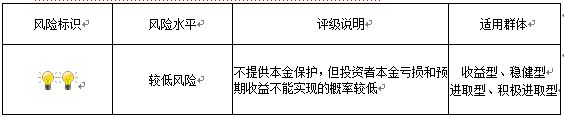 本期产品为非保本浮动收益型理财产品,不保证本金和收益,请您充分认识投资风险,谨慎投资。本期产品期限189天(中国建设银行有权对本期产品进行展期和提前终止),存续期内产品不接受申购或赎回申请。本期产品内部风险评级级别为2盏警示灯 ,风险程度属于较低风险。最不利情况下,资产组合无法回收任何本金和净收益,客户将损失全部本金。产品适合于收益型、稳健型、进取型、积极进取型客户。