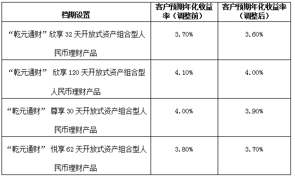 关于调整“乾元通财” 欣享120天开放式资产组合型人民币理财产品等4期产品客户预期年化收益率的公告