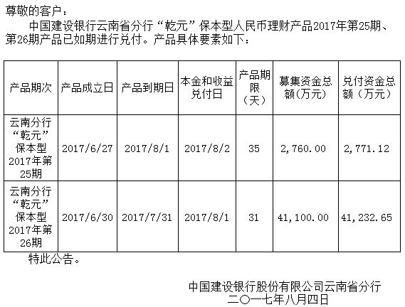中国建设银行云南省分行“乾元”保本型人民币理财产品2017年25期、26期兑付公告