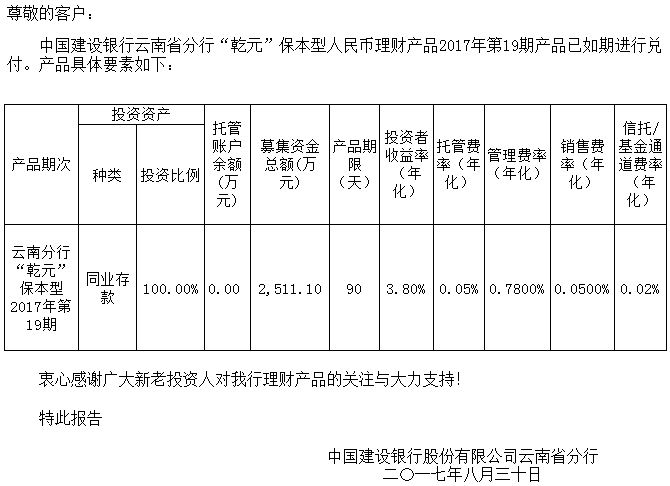 中国建设银行云南省分行“乾元”保本型人民币理财产品清算报告